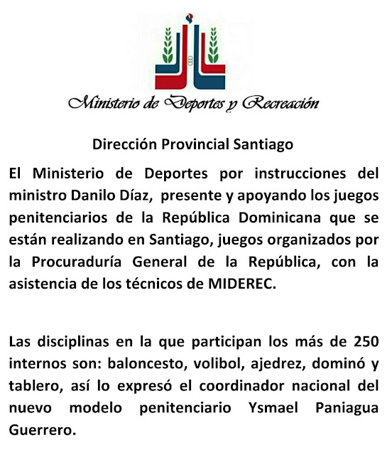 Estuvimos en el inicio de las finales de los juegos deportivos penitenciarios en La Grane Arena del Cibao, Santiago, el director provincial de deportes Radhamés Espinal nos envió otros datos, esperamos que terminen todos los deportes y le traeremos los detalles completos con otras fotos que nos trae Espinal Todo Sobre Noticias Dominicanas -11:43
